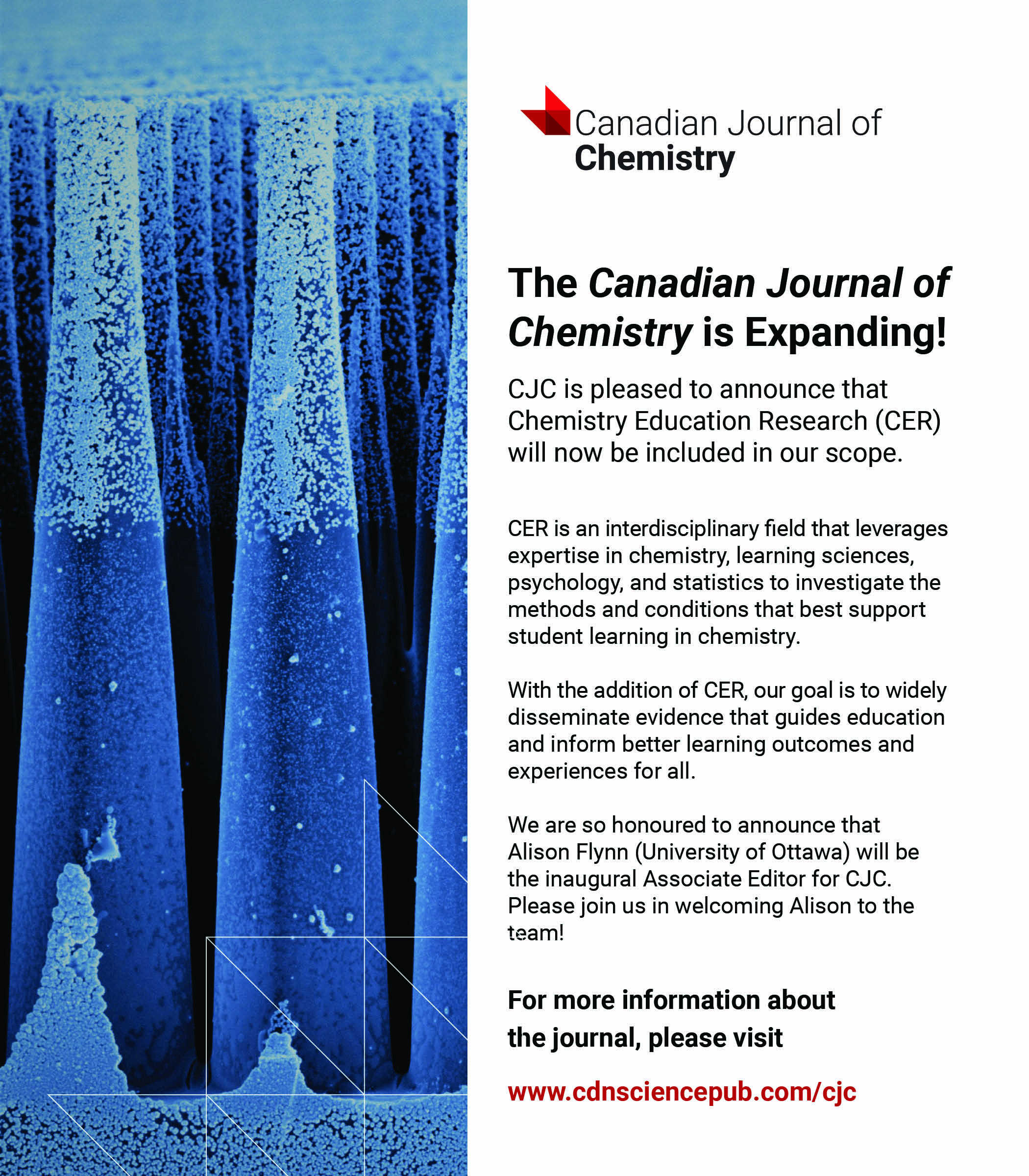The Canadian Journal of Chemistry has expanded its scope and will publish original research in Chemistry Education Research (CER). I have been appointed as the inaugural Associate Editor for CER.